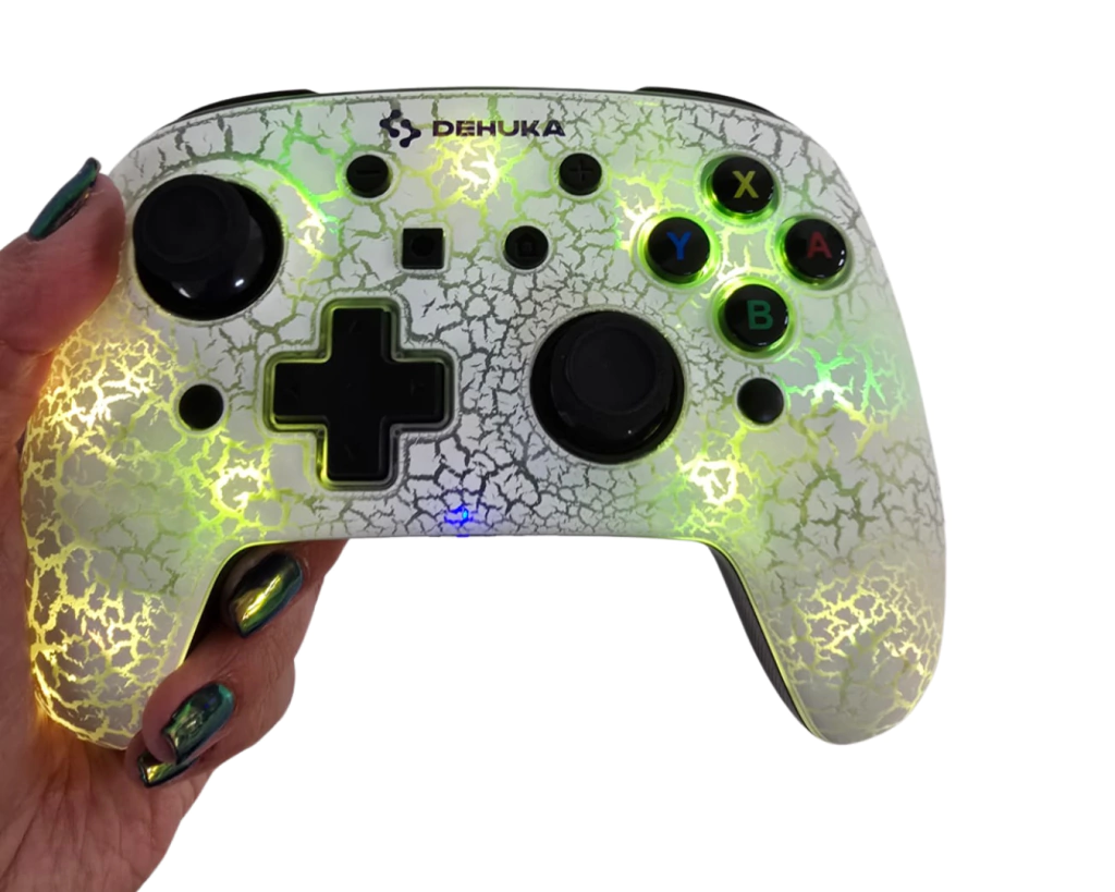 Con su diseño ergonómico y carcasa intercambiable, el Joystick Dehuka se adapta cómodamente a tus manos, garantizando horas de juego sin fatiga. Además, sus luces LED RGB ajustables no solo añaden un toque de estilo personal, sino que también ofrecen una experiencia visual inversiva que complementa tus sesiones de juego.